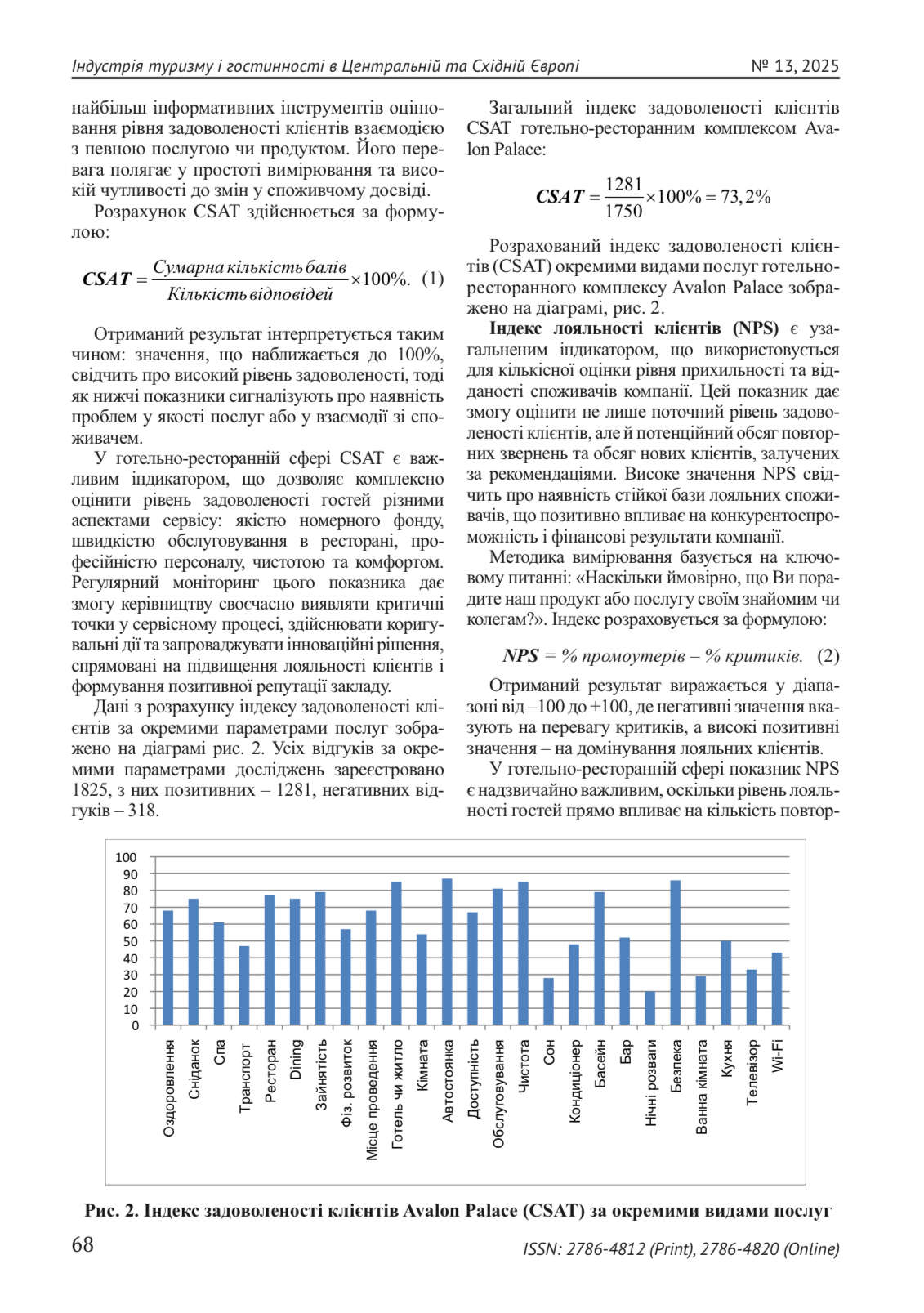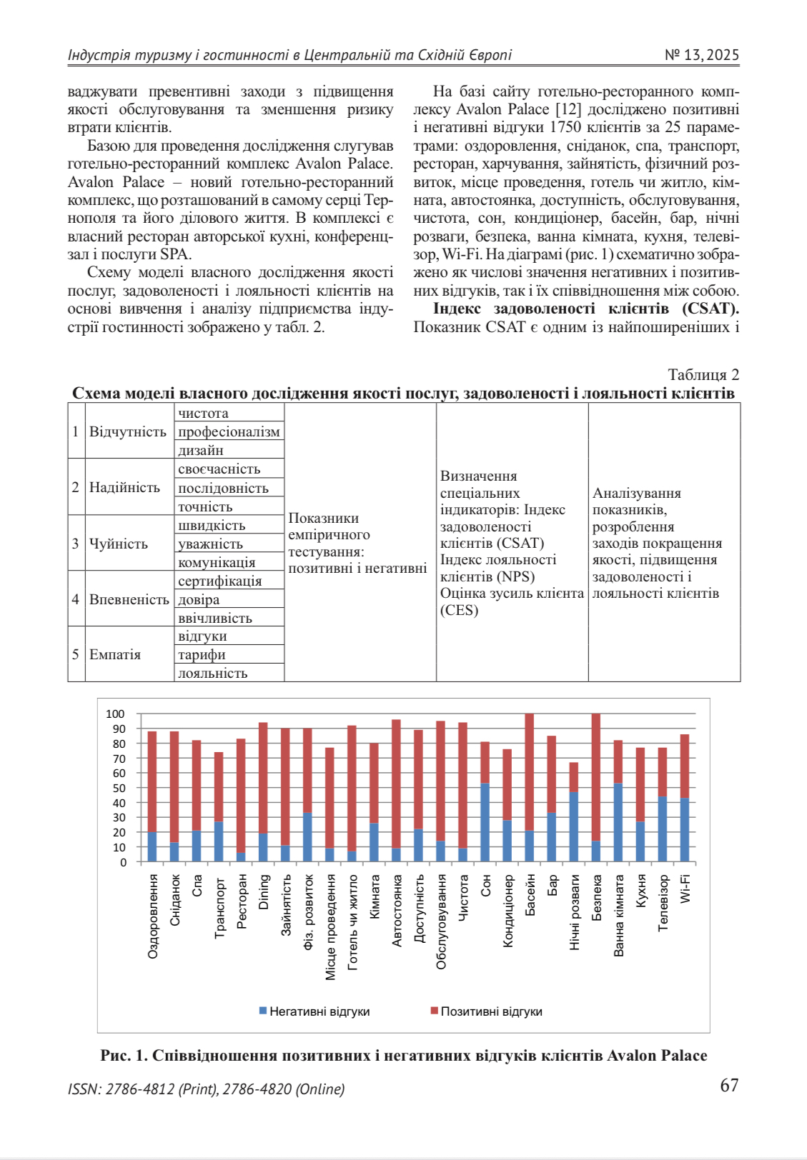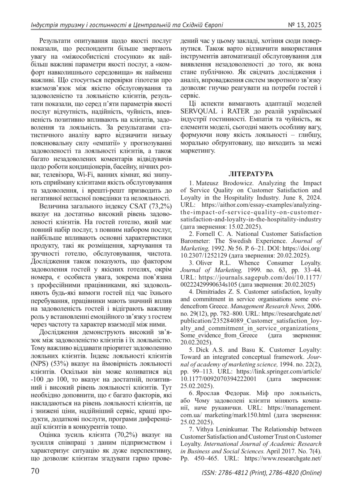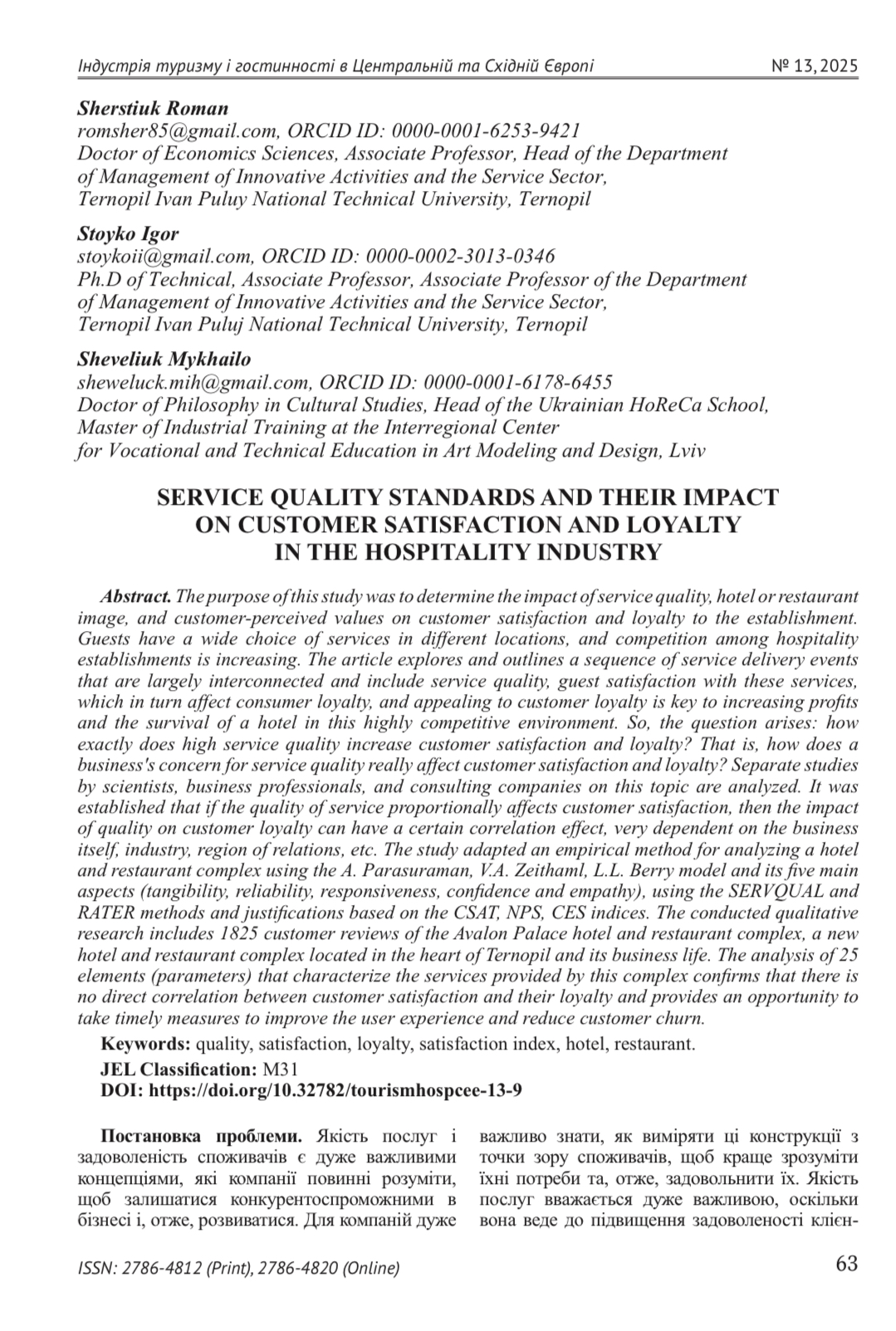 Стаття «СТАНДАРТИ ЯКОСТІ ОБСЛУГОВУВАННЯ І ЇХ ВПЛИВ НА ЗАДОВОЛЕНІСТЬ І ЛОЯЛЬНІСТЬ КЛІЄНТІВ В ІНДУСТРІЇ ГОСТИННОСТІ» у співавторстві з Шерстюк Р. П., Стойко І.І. в журналі"Індустрія туризму і гостинності в Центральній та Східній Європі", випуск № 13 / 2025.