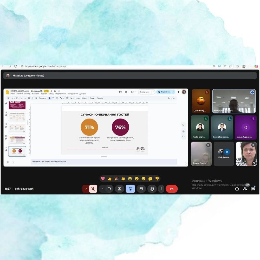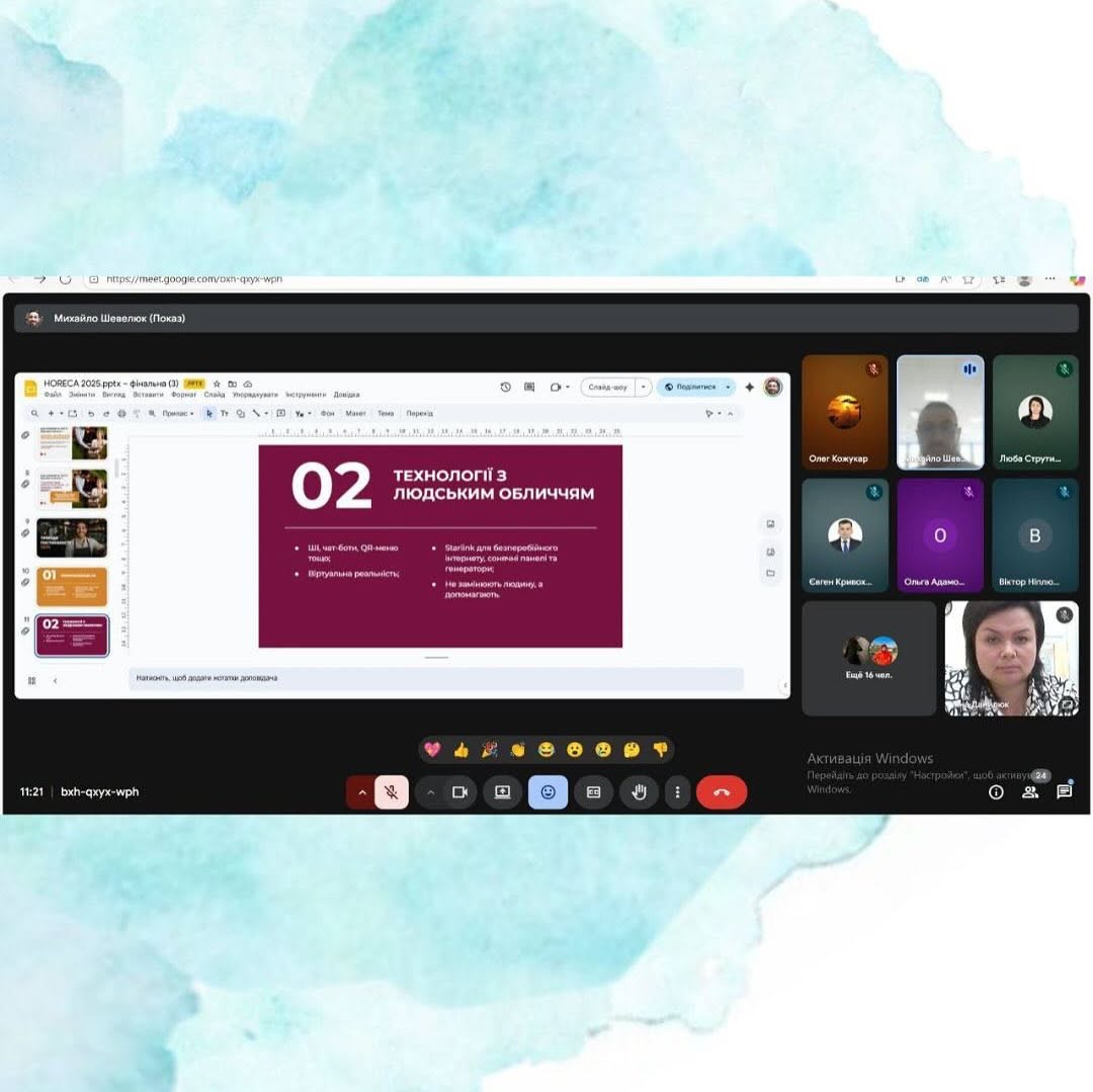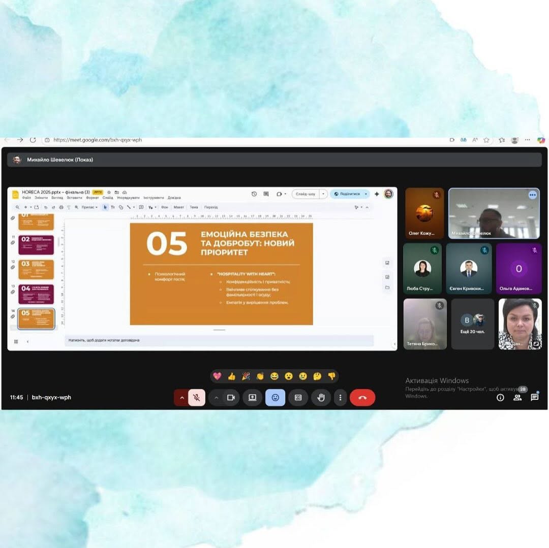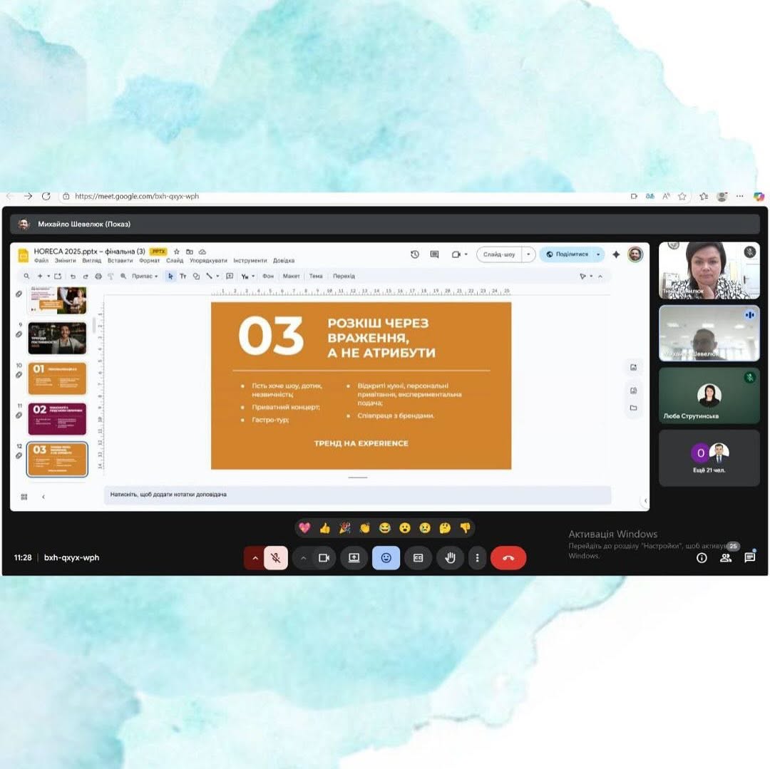On October 8, I had the pleasure of giving an online lecture for students of the Department of Food Technologies and Hotel and Restaurant Service at the Chernivtsi Institute of Trade and Economics of Kyiv National University of Trade and Economics (CTEI KNUTE) as part of the activities of the School of Culinary Mastery and Service and the Ukrainian School of Hospitality – Ukrainian HoReCa School.