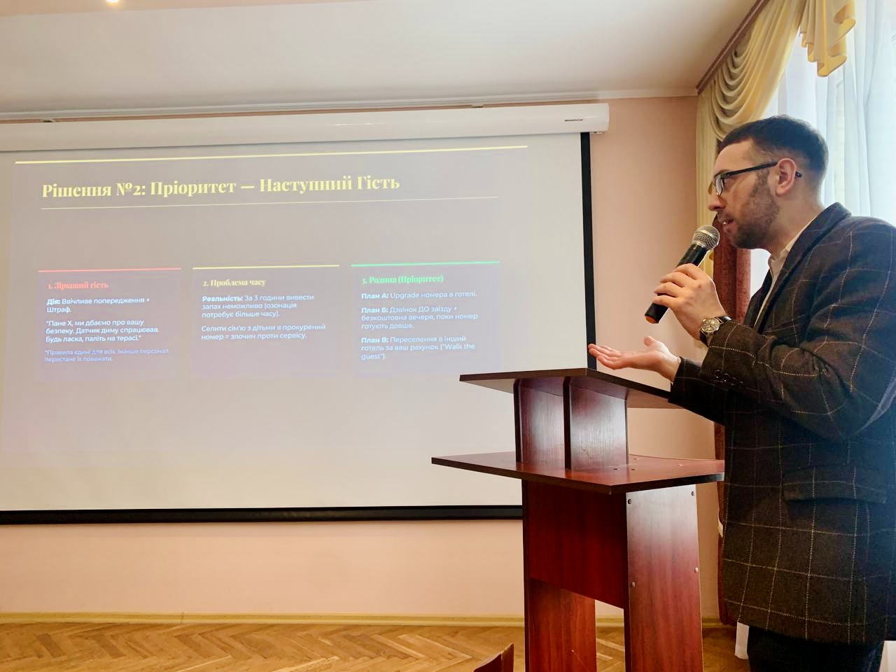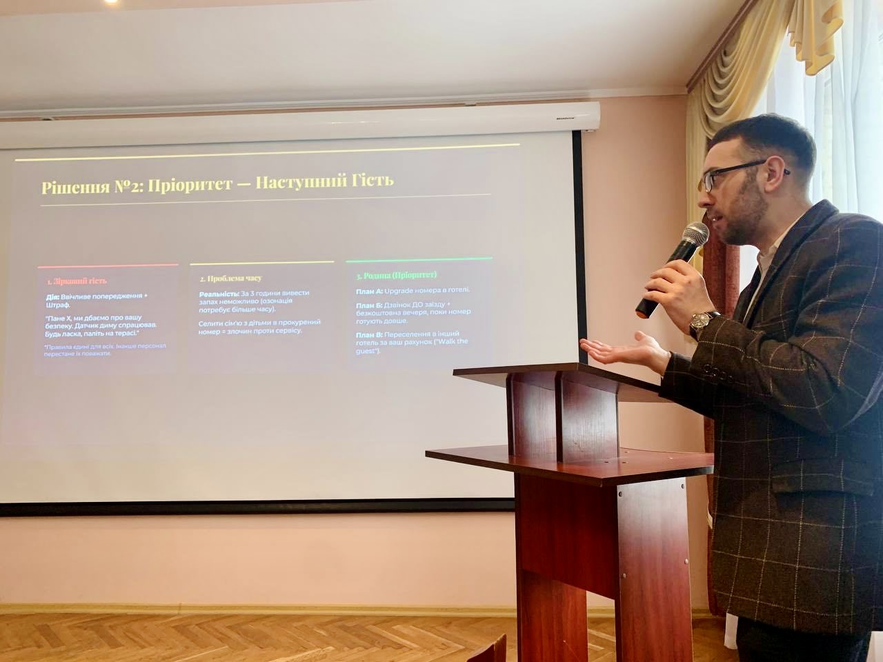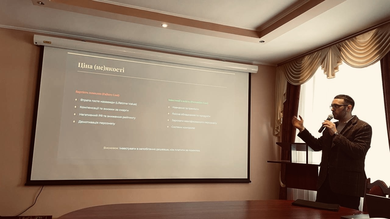 The central theme of the meeting was "Quality Management of Products and Services: From Standards to the Art of Hospitality." During the lecture, Mykhailo Sheveliuk shared practical expertise accumulated over more than 13 years of managing leading hotel and restaurant properties in Ukraine.
